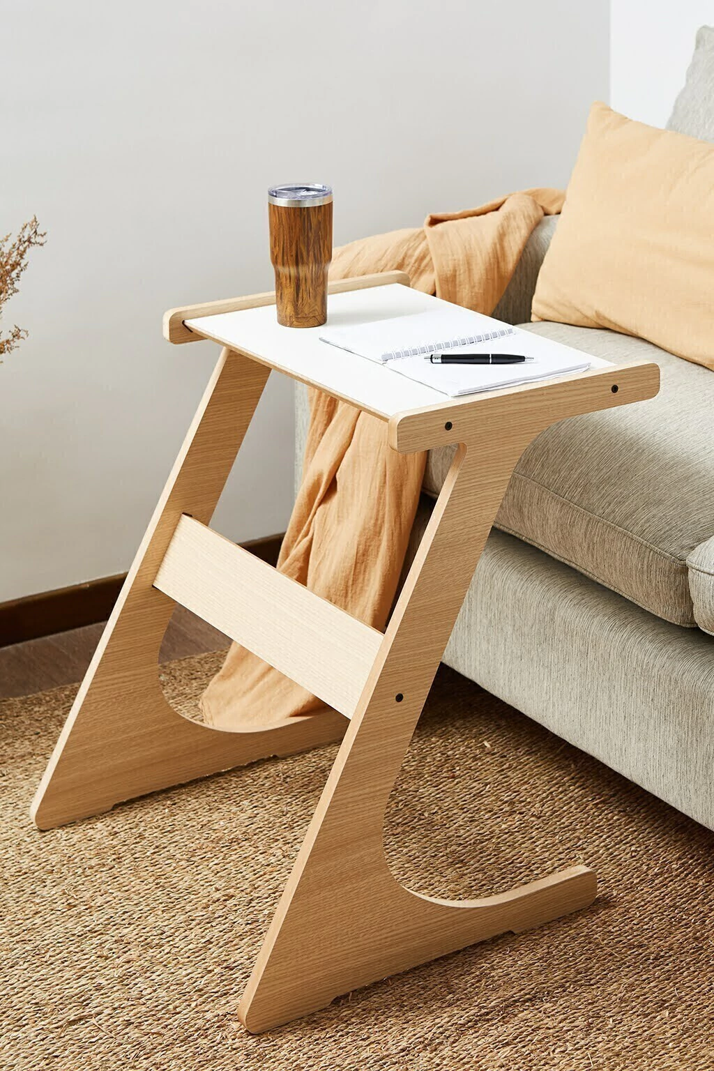 Construida en melamina de 18 mm de espesor, esta mesa garantiza resistencia y durabilidad. Los cantos invertidos a 45° en la tapa no solo aportan un toque elegante, sino que también aseguran un acabado sofisticado. La tapa blanca combinada con la base en color roble le otorgan un estilo contemporáneo que se integra perfectamente en tu hogar.